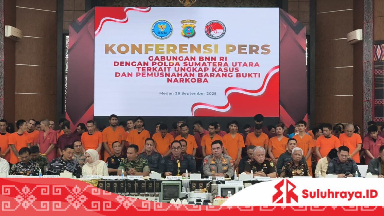 SULUH RAYA – Badan Narkotika Nasional Republik Indonesia (BNN RI) bersama Kepolisian Daerah Sumatera Utara (Polda Sumut) mengumumkan pengungkapan besar kasus narkotika di Sumut dan Aceh. Dari hasil operasi gabungan, aparat berhasil menjerat 6.004 tersangka dengan total barang bukti 1,7 ton sabu.