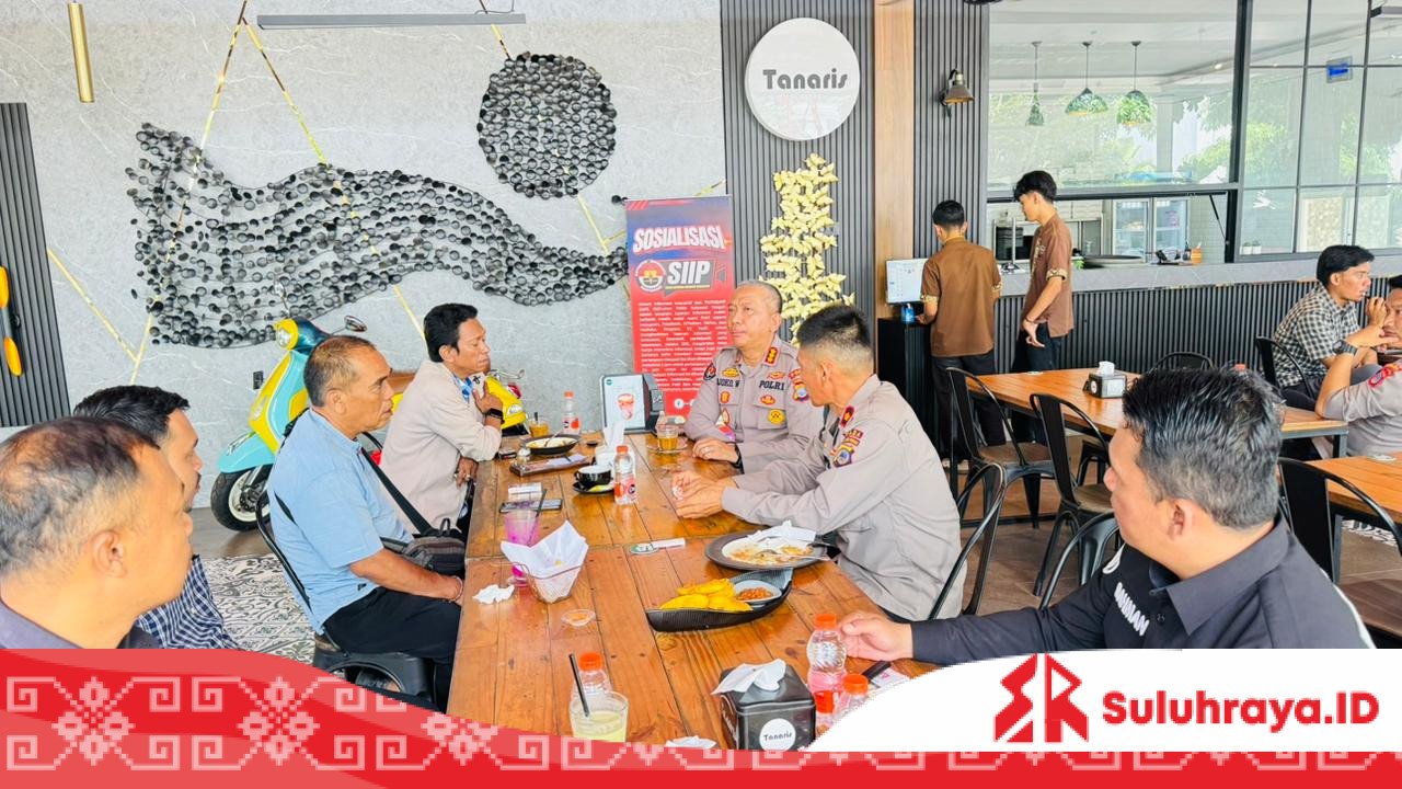 SULUH RAYA – Suasana akrab terlihat saat Kabidhumas Polda Sulawesi Tengah, Kombes Pol Djoko Wienartono, S.I.K., S.H., M.H., bertatap muka dengan sejumlah jurnalis di salah satu warung kopi Kota Palu, Kamis (2/10/2025).