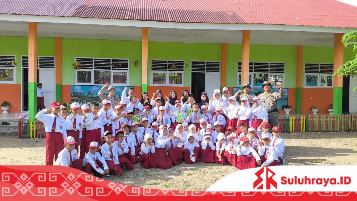 Tak hanya memberikan materi, personel juga menyerahkan bantuan sarana kontak berupa tas sekolah dan alat tulis kepada para siswa. Pembagian ini disambut gembira para pelajar yang terlihat antusias menerima perlengkapan belajar tersebut.
